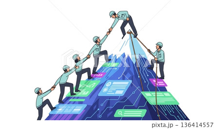 扁平化設計的插畫,描繪了人們用繩索攀爬懸崖的場景。