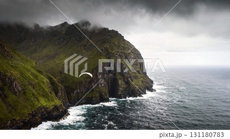 Paraglider flying over dramatic sea cliffs with rugged mountains and stormy ocean waves in ultra HD nature landscape