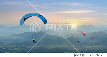 Paragliding in the sky. Paraglider flying over Landscape sun set Concept of extreme sport,
