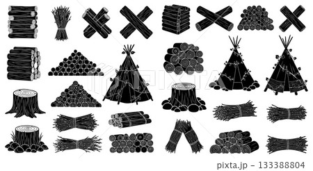 Collection of wood logs, bundles of sticks, and tree stumps, along with teepee structures, presented as outdoor camping elements