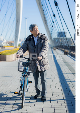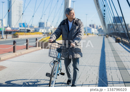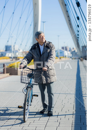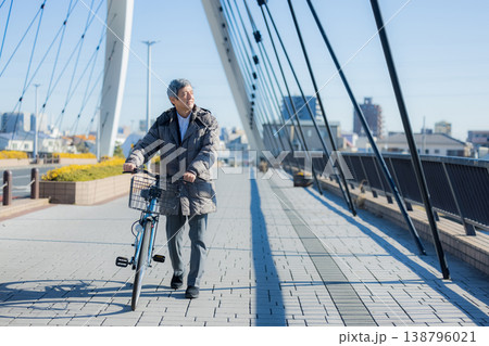 一名六十多歲的男子推著自行車行走