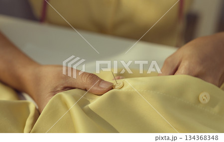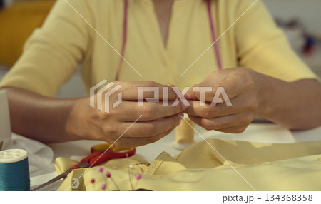 Asian woman threading the needle. Tailor working in her studio with focus in hands putting thread in sewing needle.