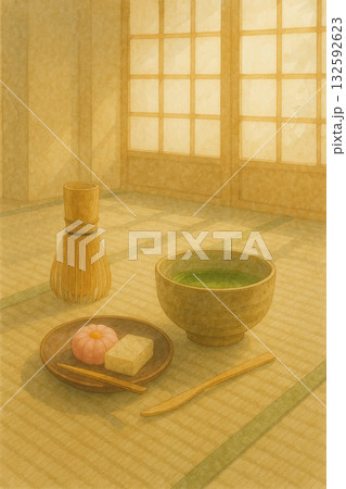 日式現代空間的插圖素材,您可以在這裡享用抹茶