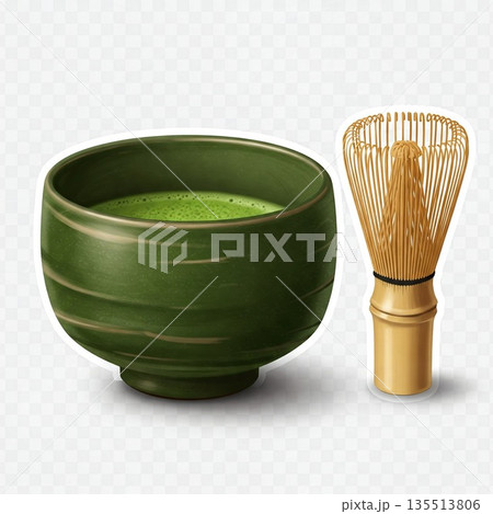 抹茶和竹筅、抹茶粉和茶葉的水彩畫