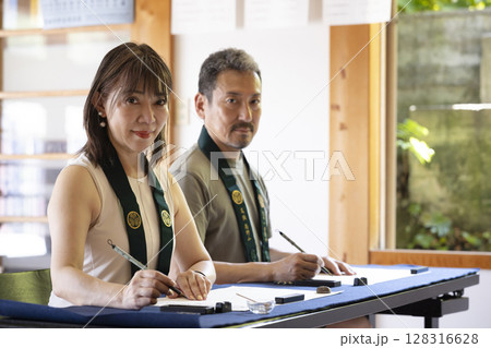 一對夫婦在寺廟體驗抄寫佛經