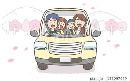 向量插圖,描繪了一家人面帶笑容地駕車行駛在櫻花樹下。