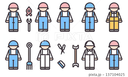 Flat illustration of workers various uniforms and tools, representing different professions and tasks. design is minimalistic and colorful