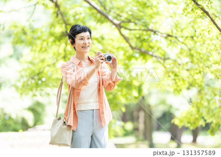 公園裡拿著相機的女人