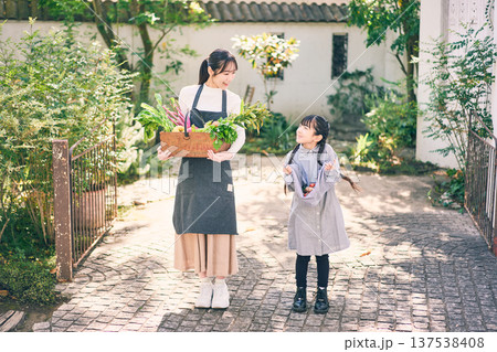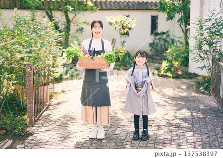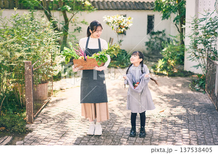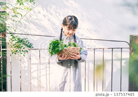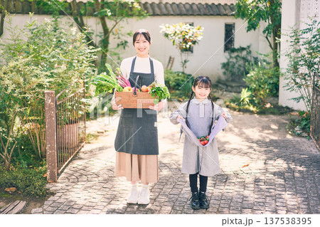 父母和孩子坐在長椅上,手裡拿著蔬菜