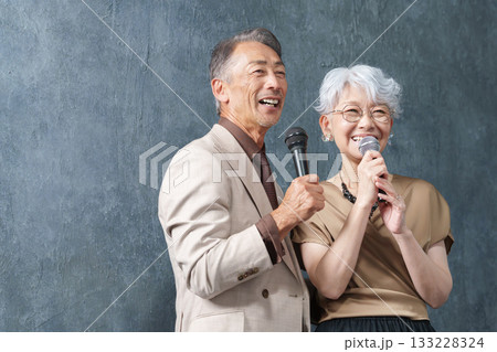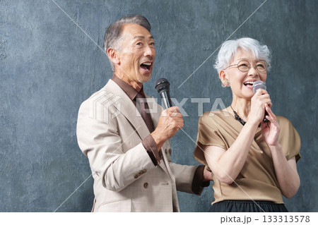 老年男女在卡拉OK台上拿著麥克風唱歌