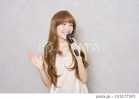 中年婦女手持麥克風唱歌,肖像,灰色背景