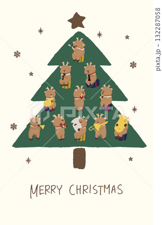 聖誕樹上裝飾著拿著樂器的馴鹿的插圖(純色,可愛)