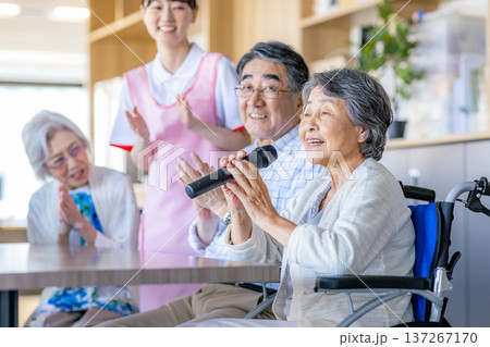 老年男女在卡拉OK台上拿著麥克風唱歌