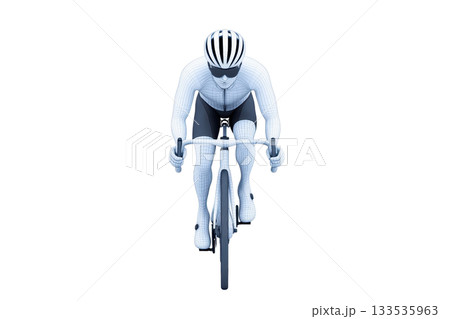 A cyclist in a racing pose, wearing a helmet and fitted attire, is riding a sleek bike, showcasing speed and athleticism.