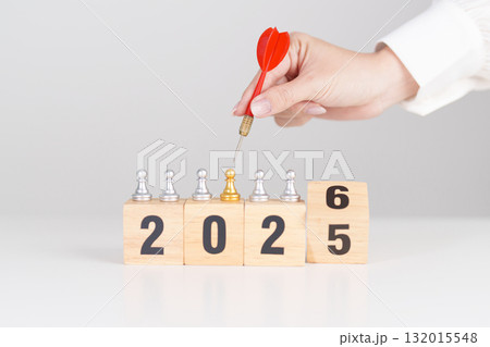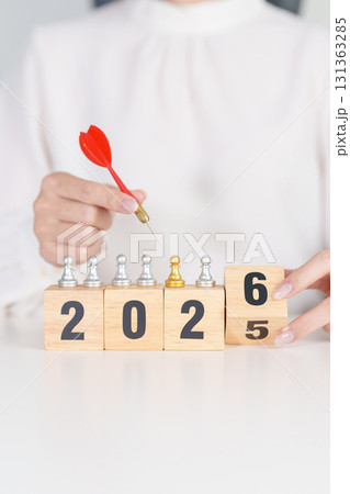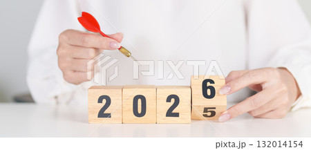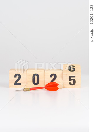 2025 year change to 2026 year block with dartboard icon. Goal, Target, Resolution, strategy, plan, Action, mission, motivation, and New Year start concepts