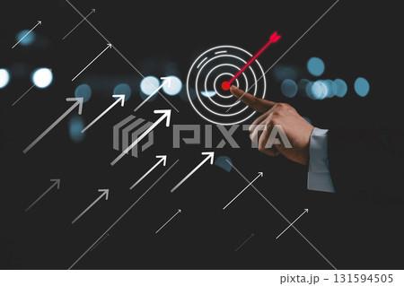 Businessperson touching virtual dartboard with arrow, Business achievement objective target concept. strategy and support of technology, business aims its arrow toward target market, growth, success.