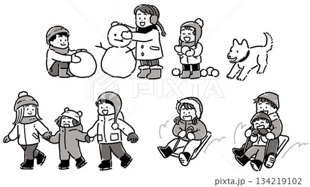 描繪兒童和狗在雪地裡玩耍的單色插圖