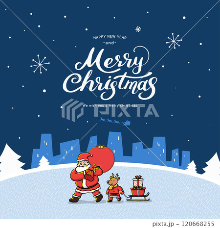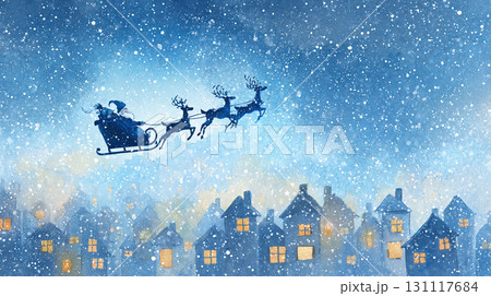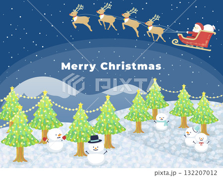 背景是聖誕老人在雪地裡飛翔,閃閃發光的雪路上排列著被照亮的樹木和雪人(橫向)