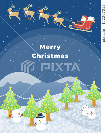 背景是聖誕老人在雪地裡飛翔,閃閃發光的雪路上排列著被照亮的樹木和雪人(垂直)