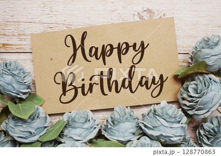 Happy Birthday text on paper card with rose flowers bouquet on wooden background