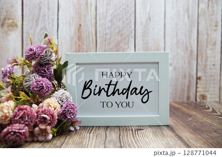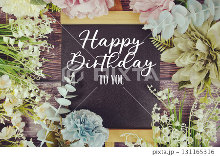 Happy Birthday to you text with flowers bouquet decoration on wooden background