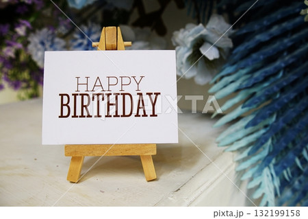 Happy Birthday text write on paper card with wooden easel and flowers decoration on wooden background