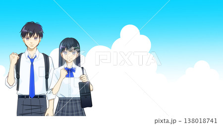 湛藍的天空,以及一幅動漫風格的高中或國中男生和女生的插圖。