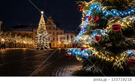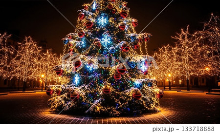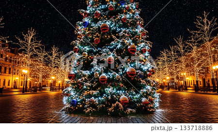 夜晚,城市裡一棵裝飾精美的聖誕樹閃閃發光。