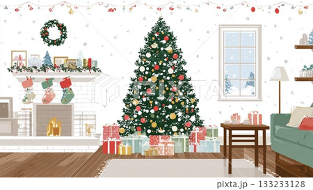 Photorealistic Christmas Living Room Scene with Beautifully Decorated Christmas Tree, Warm Holiday Lighting, and Festive Interior Atmosphere