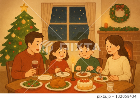Celebrate Christmas with family in a cozy, festive setting. Santa hats, gifts, and delicious food capture the warmth, joy