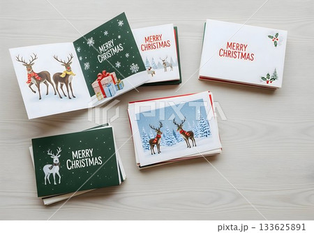 Collection of Merry Christmas greeting cards with reindeer design on wooden background
