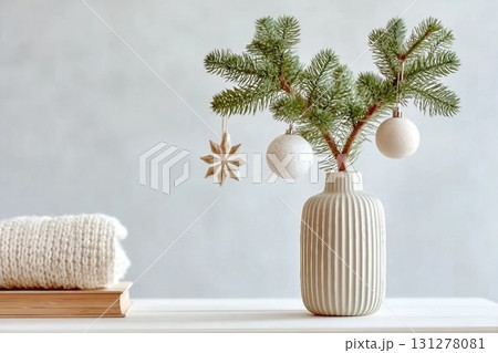 Christmas, New Year home decor. Empty white wall mock up with green fir branches in a vase on a white table. Mock up for displaying works