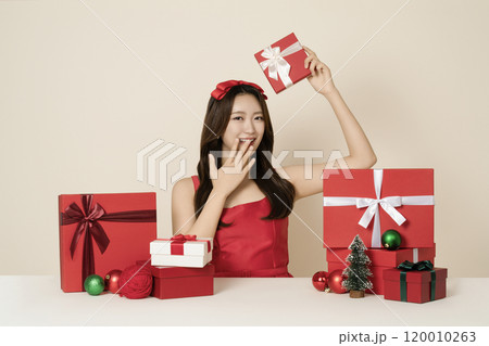 Woman surprise got present gift box on christmas eve. Asian woman holding christmas gift box under xmas tree with smiling face. Woman hands wrap present gift. Merry christmas happy new year concept