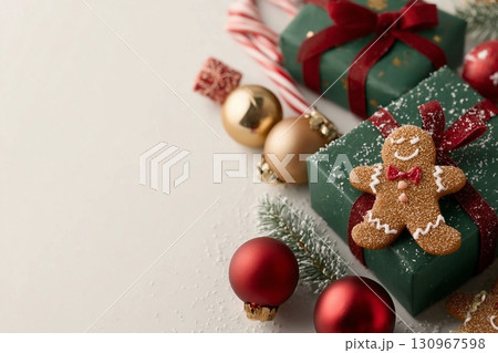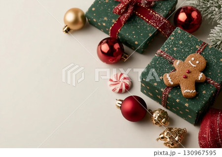 Delightful holiday tableau from top view emerald gift boxes, red, green, and golden baubles, gingerbread man ornament, jingle bells, candies, frosty fir twig, light background with space for greeting