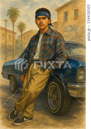 街頭青年倚靠老車的西岸風格水彩插畫