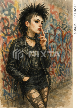 街頭塗鴉背景下的龐克風格女性 水彩插畫