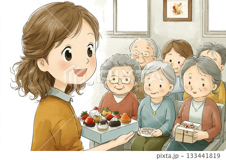 一幅動漫風格的插圖,描繪了一家三代人一起享受聖誕節的場景