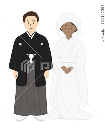 身穿日本傳統婚禮服飾的新郎和新娘插圖 - 國際婚姻