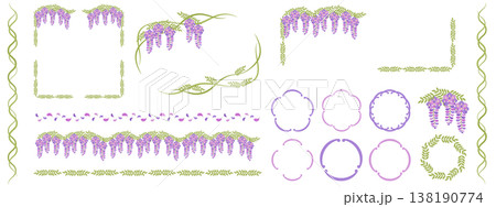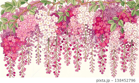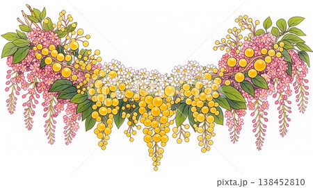 裝飾插畫素材,以優雅下垂的花簇和嬌嫩的花朵為特色,春季背景,植物邊框。