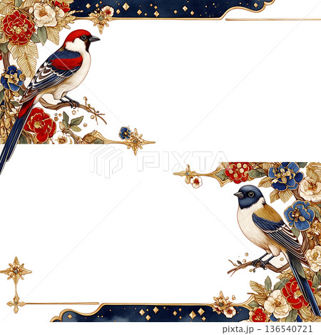裝飾邊框背景插圖,飾以絢麗的花鳥圖案。高解析度設計素材,中央留白。