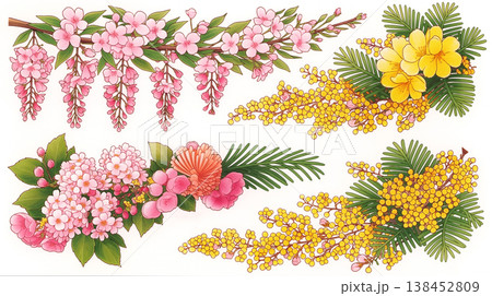 美麗的植物插圖素材,以繁茂的花簇、春天的背景、花卉邊框和花環為特色。