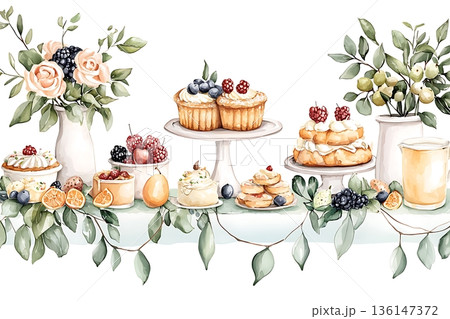 Delicate Watercolor Dessert Arrangement with Berries and Easter Eggs on a White Background