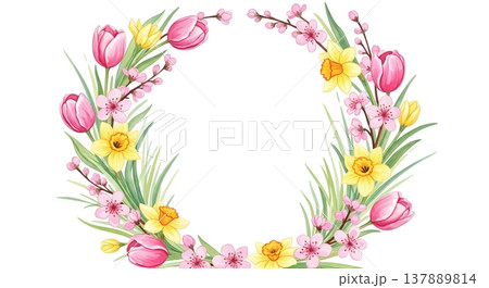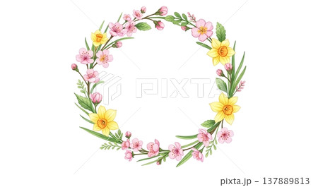 水彩粉紅花卉圓形花環春季PNG摳圖邊框素材