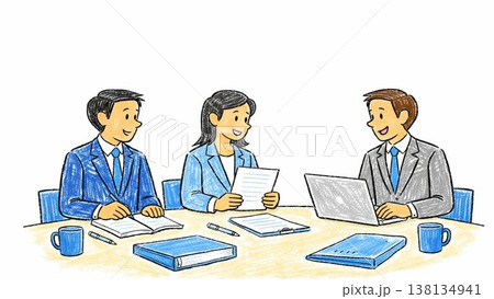 一幅描繪商務會議的插圖,三個人一邊查看文件一邊討論。