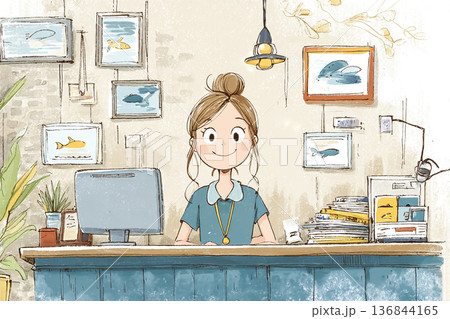 前台一位面帶微笑的女工作人員的插圖
