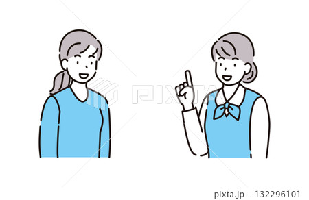 一位身穿圍巾式製服和背心的女士用雙手指向的插圖