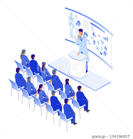 醫生正在就醫療數位轉型進行講座的等距插圖及參與者