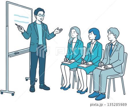 插畫素材:一群身著西裝的年輕男女拿著教鞭講解