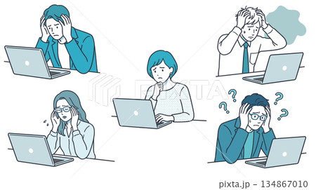 一組插圖,描繪了男女在使用電腦時遇到的困難、問題和困惑(人工智慧製作)。