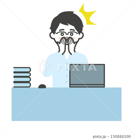 一名男子在辦公桌上使用筆記型電腦,驚訝地用手摀住嘴巴的插圖